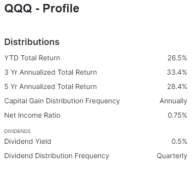 나스닥100 지수를 추종하는 미국 ETF인 QQQ를 보면 배당률은 0.5%로 나타남