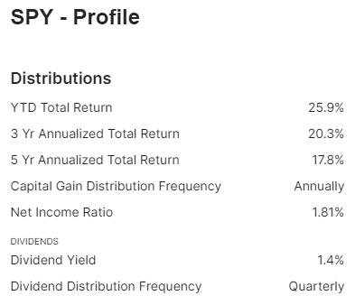 S&P500 지수를 추종하는 미국 ETF인 SPY를 보면 배당률은 1.21%로 나타남