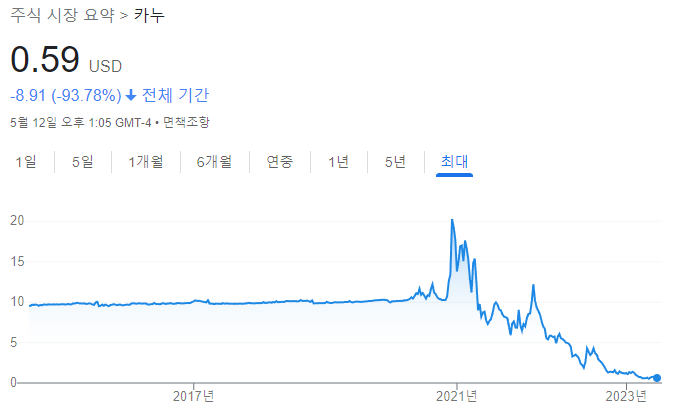 현재 주가는 0.59달러의 동전주가 되었다 (2023년 5월 기준)