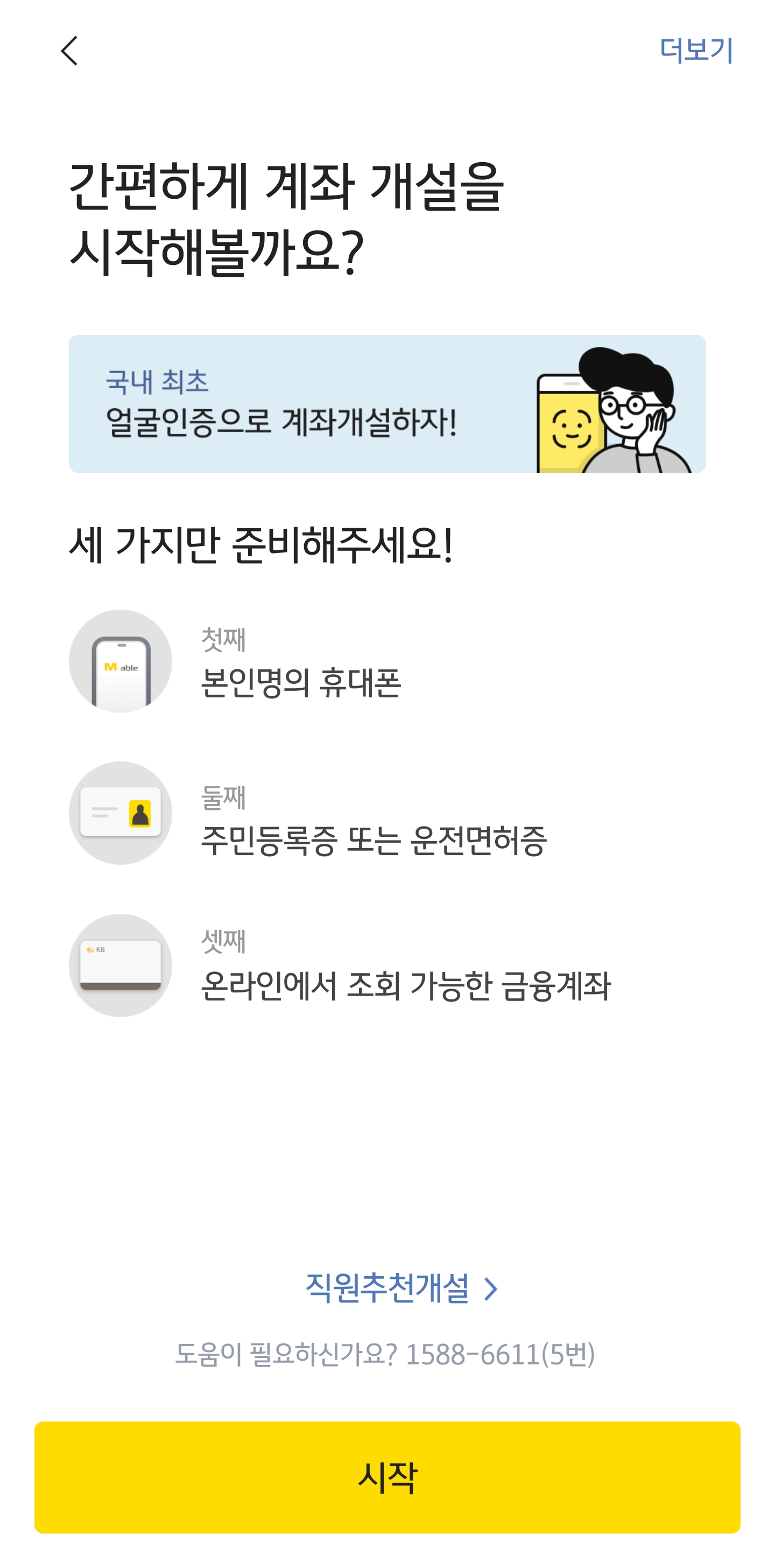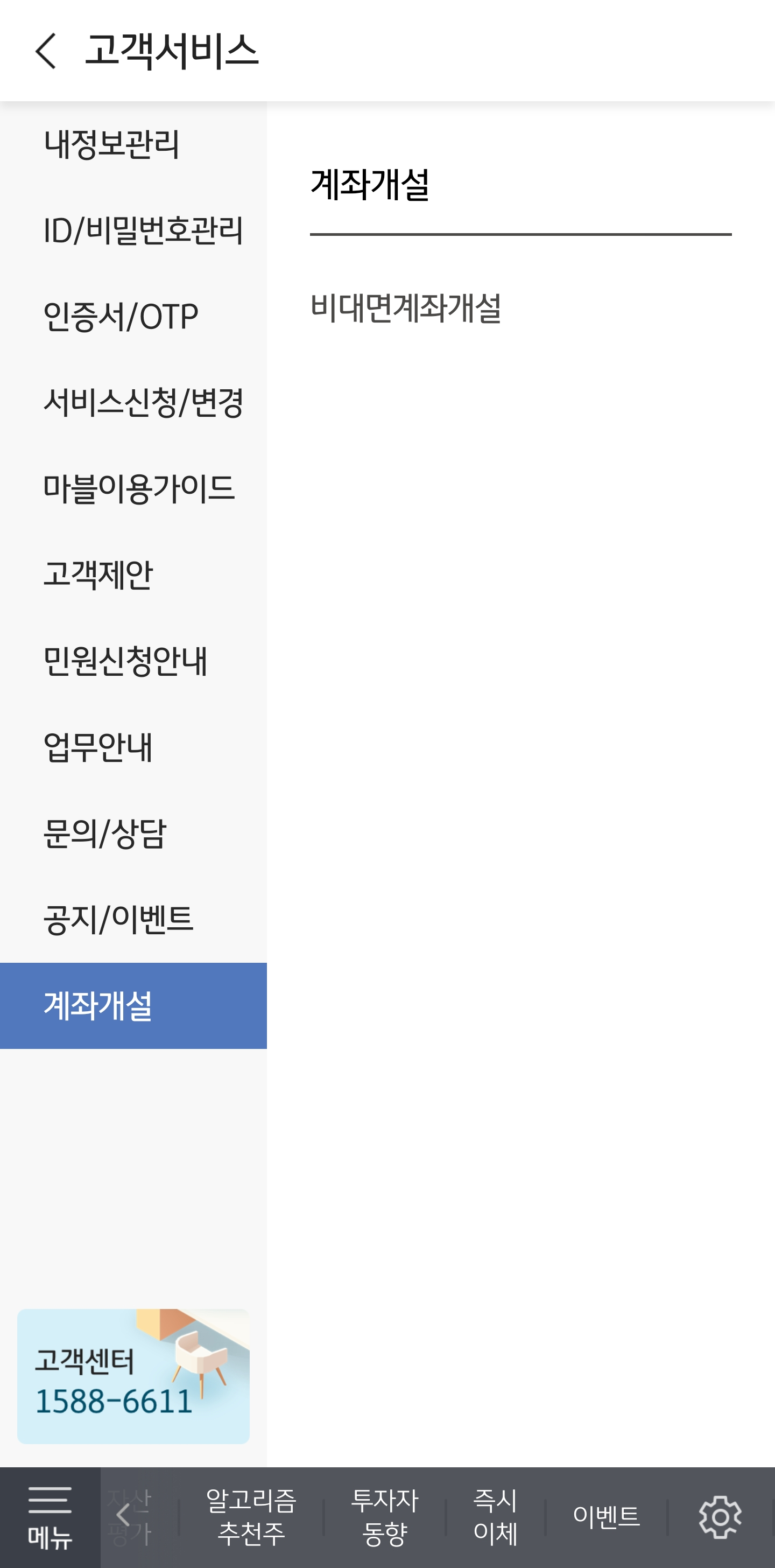 나는 주거래은행이 국민은행이라는 단순한 이유로 KB증권에서 개설해서 사용중이다. KB증권의 증권사 어플이름은 M-Able 이다. 어플을 다운로드 받아서 실행시키고 메뉴로 들어가서 고객서비스를 눌러주면 계좌개설 메뉴를 확인할 수 있다. 비대면계좌개설을 시작하자.