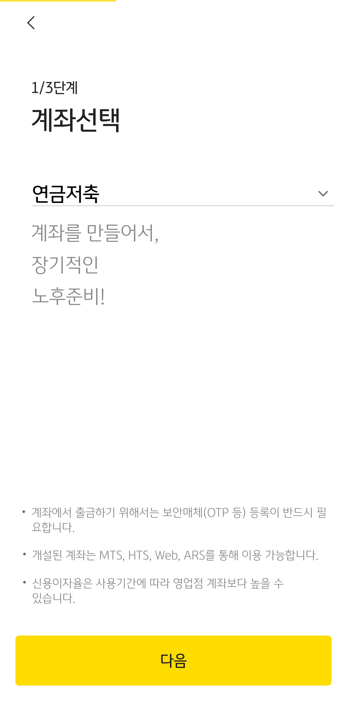 계좌선택 부분에서 연금저축을 선택해주면 연금저축펀드계좌만 개설할 수 있다. 이 다음 부터는 휴대폰 인증 혹은 공인인증서(공동인증서)를 통해서 본인확인을 해주고 신분증 사진을 찍고 차례대로 개설해주면 되는 부분이다.