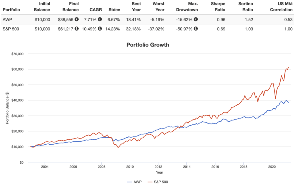 2002년부터 2021년 2월까지 S&P 500 대비 올웨더포트폴리오의 백테스트 결과는 다음과 같다.