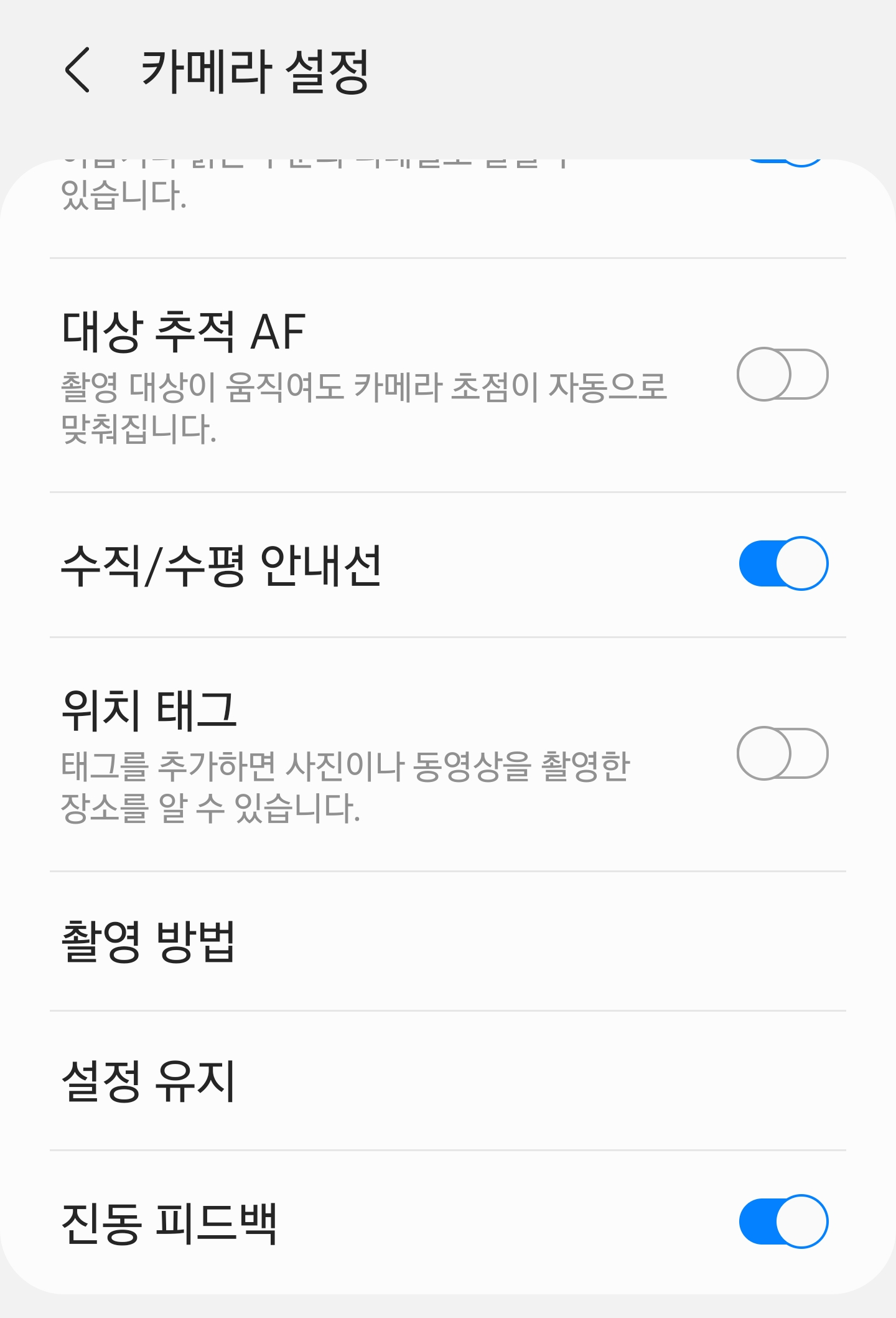기본 카메라 설정에서 진동 피드백을 꺼주면