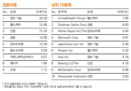 상위 10개 종목을 보면 골드만삭스, 홈디포, 마이크로소프트, 비자, 보잉, 맥도날드 등
